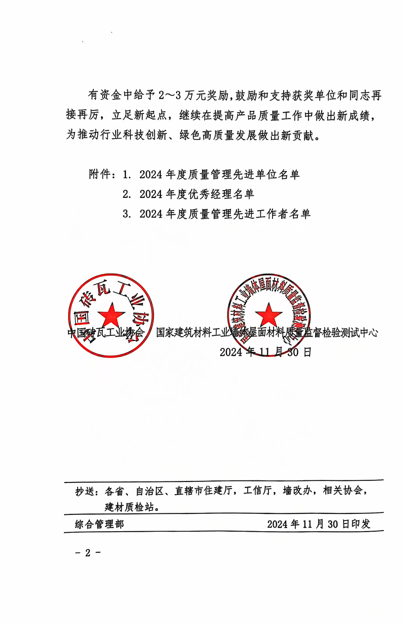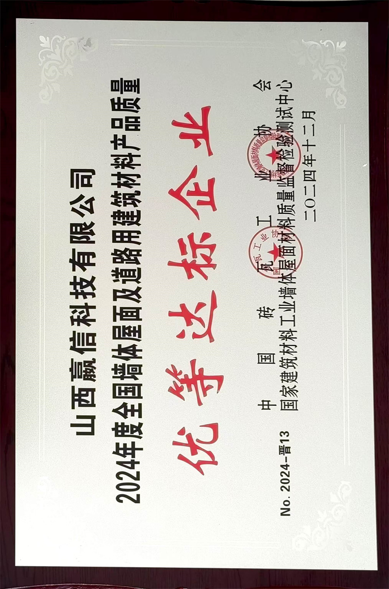 2024年度全国墙体屋面及道路用建筑材料产品质量评审中,我们公司产品获得优等达标产品,企业获得优等达标企业称号