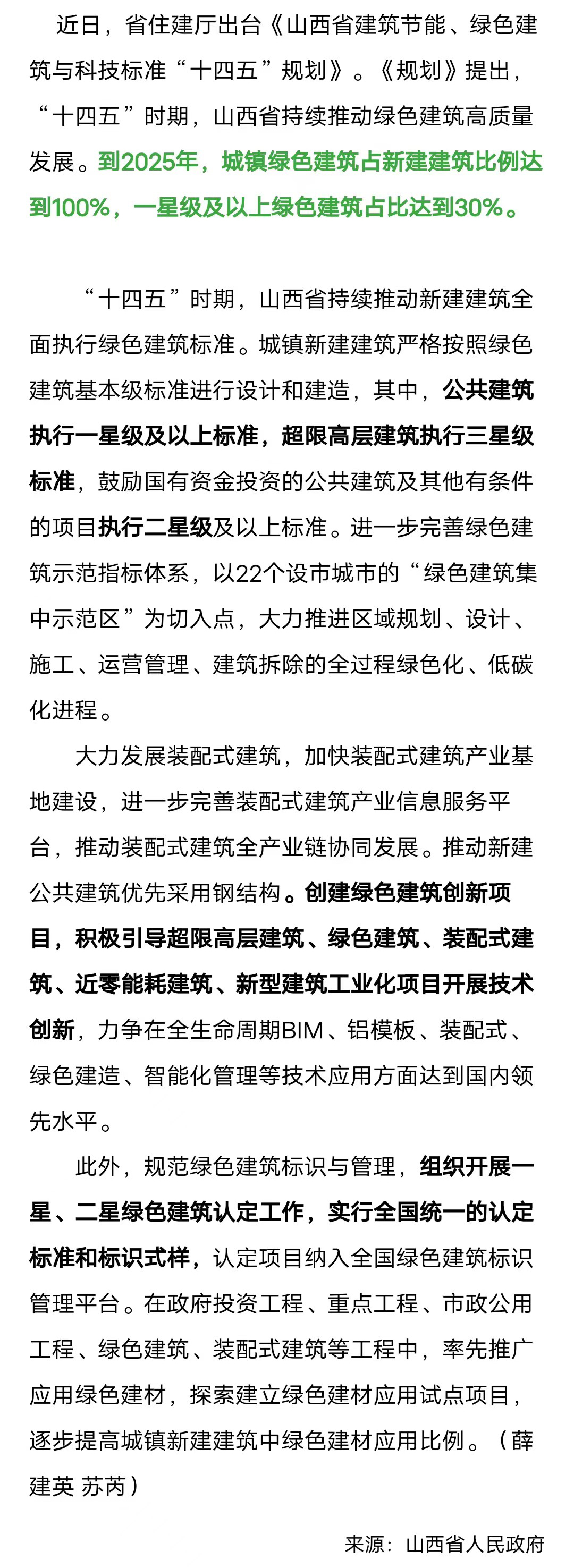 到2025年 城镇新建筑 “绿色”--《山西省建筑节能、绿色建筑与科技标准“十四五”规划》出台