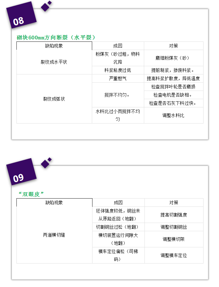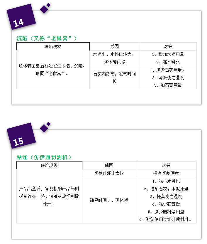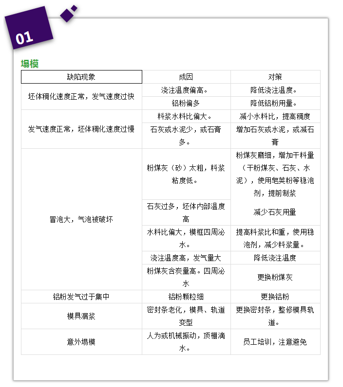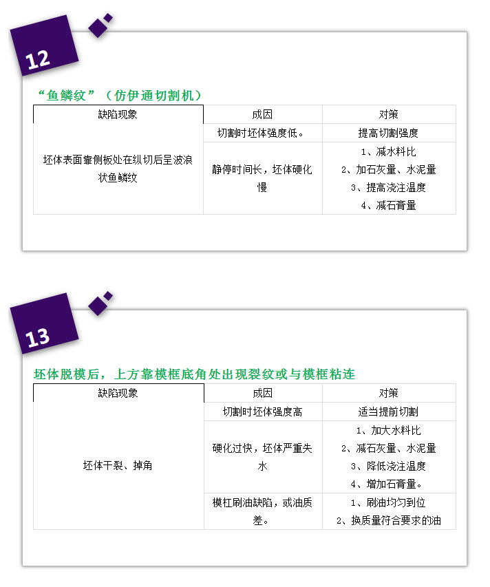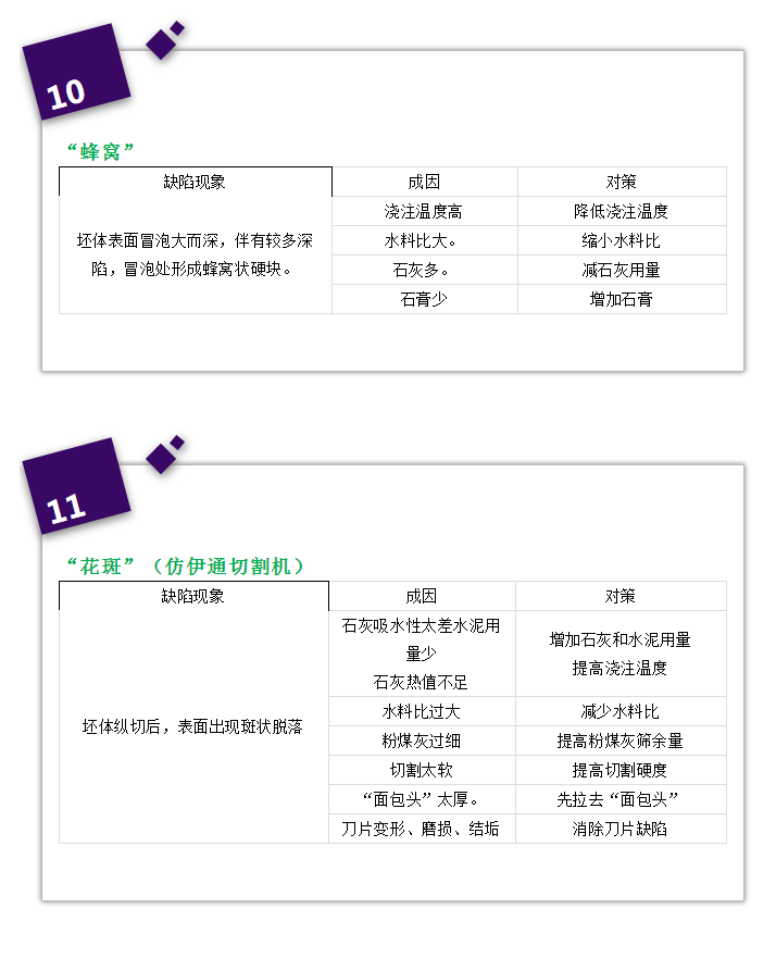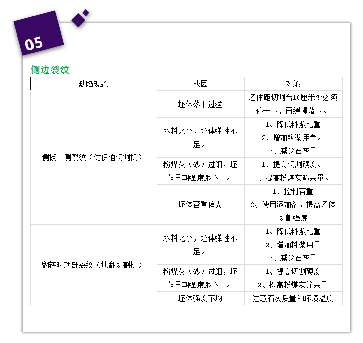 由于加气混凝土生产企业采用的原材料差异较大,工艺技术多种多样,没有一个定式能够一概而论,生产过程中的质量掌控变得尤为重要,下面总结加气混凝土生产过程中常见的缺陷成因和解决对策以供参考,不足之处,欢迎大家指正,欠缺之处欢迎评论区留言,小编会进一步完善。