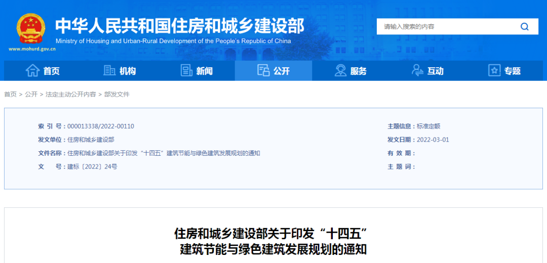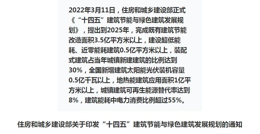 3月11日,住房和城乡建设部发布《关于印发“十四五”建筑节能与绿色建筑发展规划的通知》,规划提出,到2025年,城镇新建建筑全面建成绿色建筑,建筑能源利用效率稳步提升,建筑用能结构逐步优化,建筑能耗和碳排放增长趋势得到有效控制,基本形成绿色、低碳、循环的建设发展方式,为城乡建设领域2030年前碳达峰奠定坚实基础。
